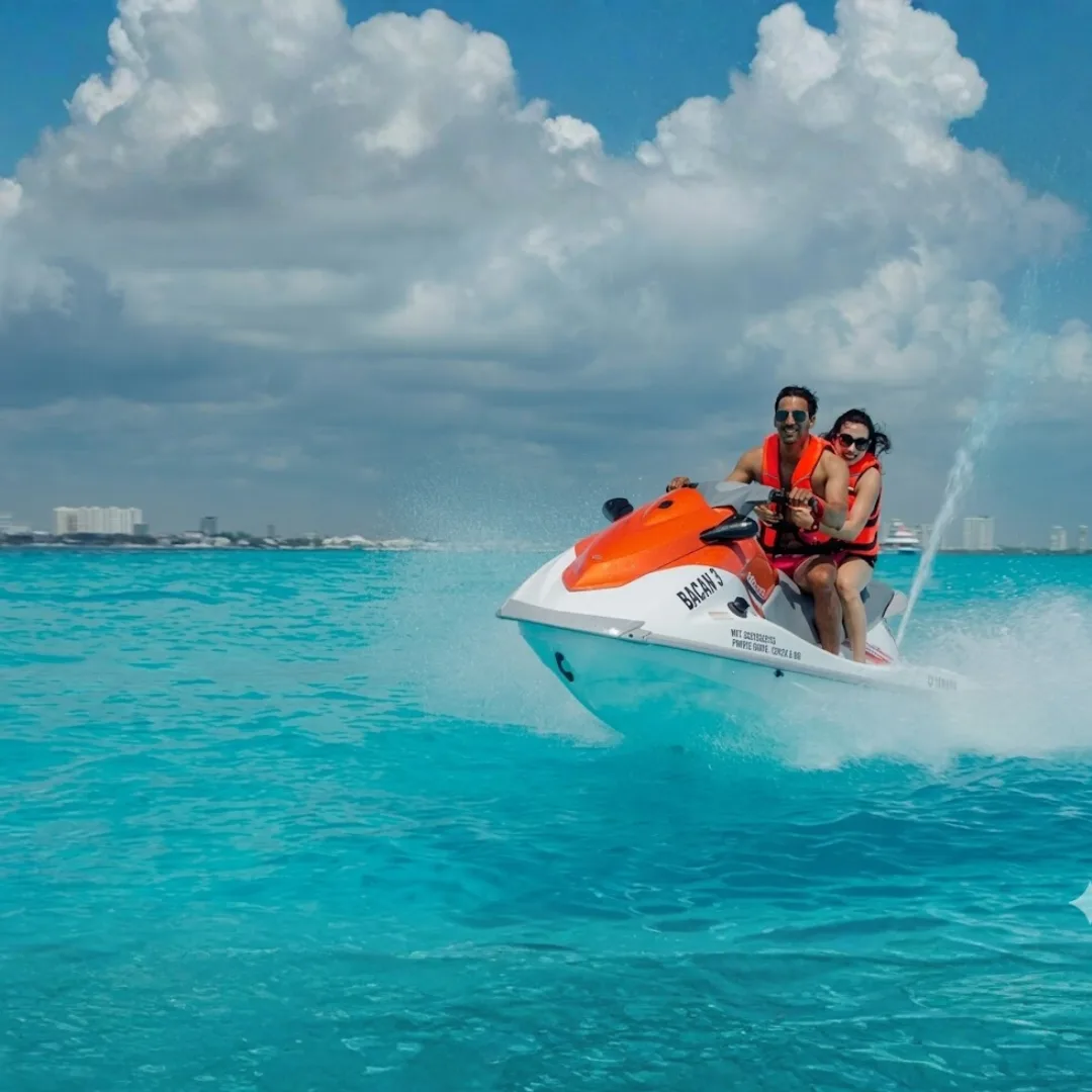 Disfruta 60 minutos de velocidad y diversión sobre una moto de agua Waverunner en Cancún, con vistas espectaculares al mar Caribe y a la Zona Hotelera.