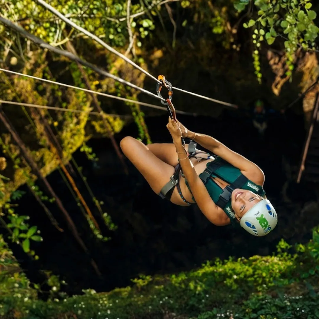 - Tirolesas y saltos de altura en K’áak’, un cenote abierto, y en un cenote antiguo.