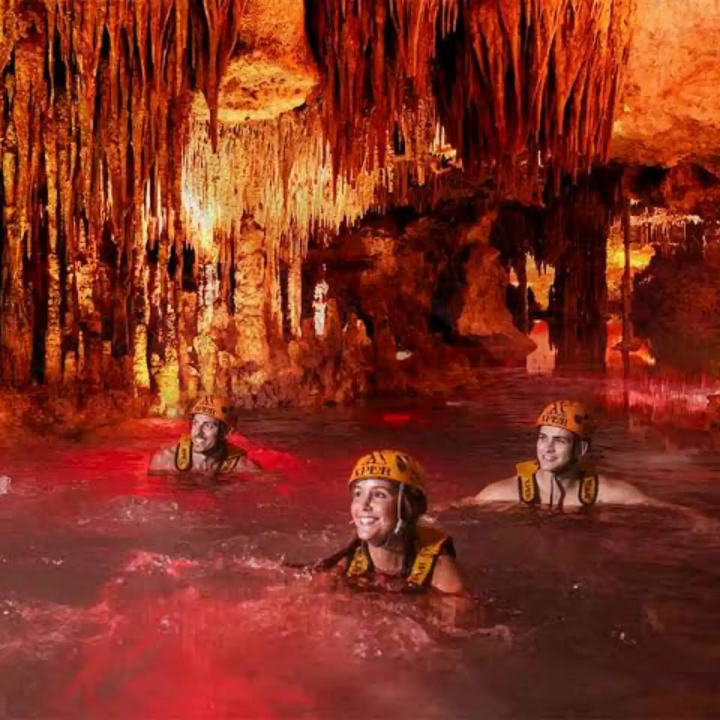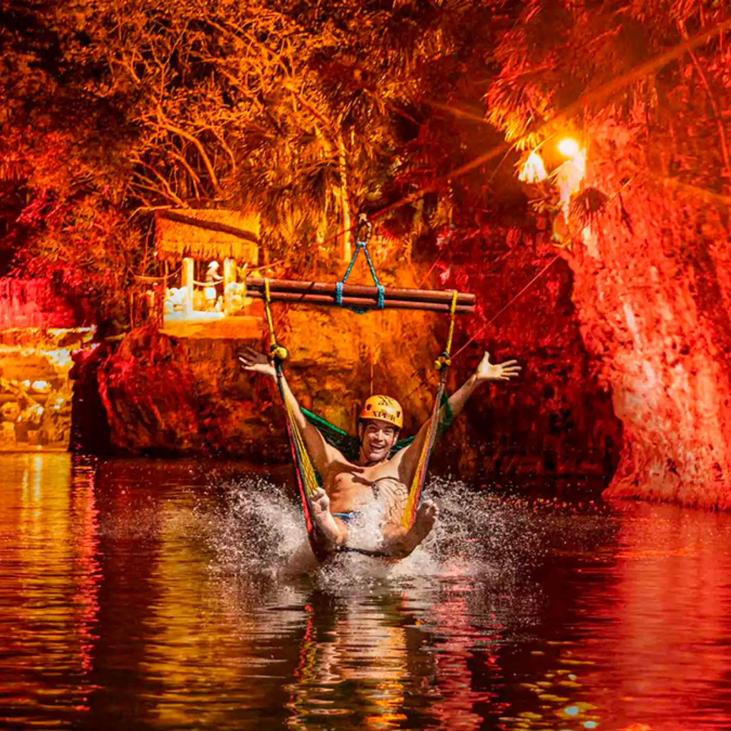 Vive una noche llena de adrenalina con tirolesas nocturnas, vehículos anfibios, ríos subterráneos, balsas y cavernas iluminadas con fuego, además de buffet ilimitado y bebidas sin alcohol. Todo en un entorno nocturno increíble rodeado de selva y cuevas.